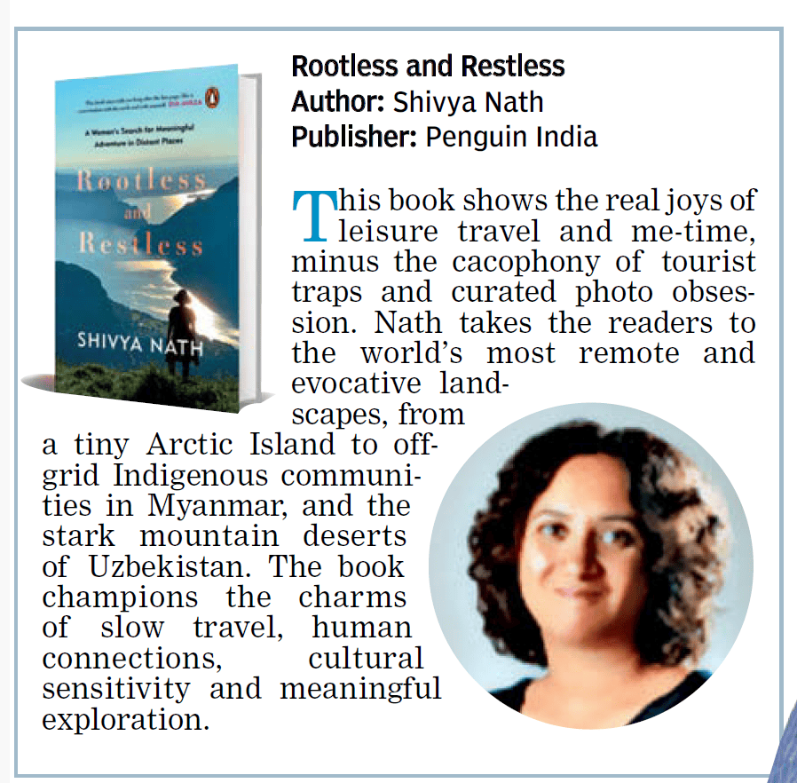“Rootless and Restless is a rare kind of travel memoir, one that doesn’t chase destinations but listens deeply to people, landscapes, and the quiet questions we carry within us. Shivya Nath writes with courage and tenderness about moving through remote places while searching for a sense of belonging, dignity, and connection.