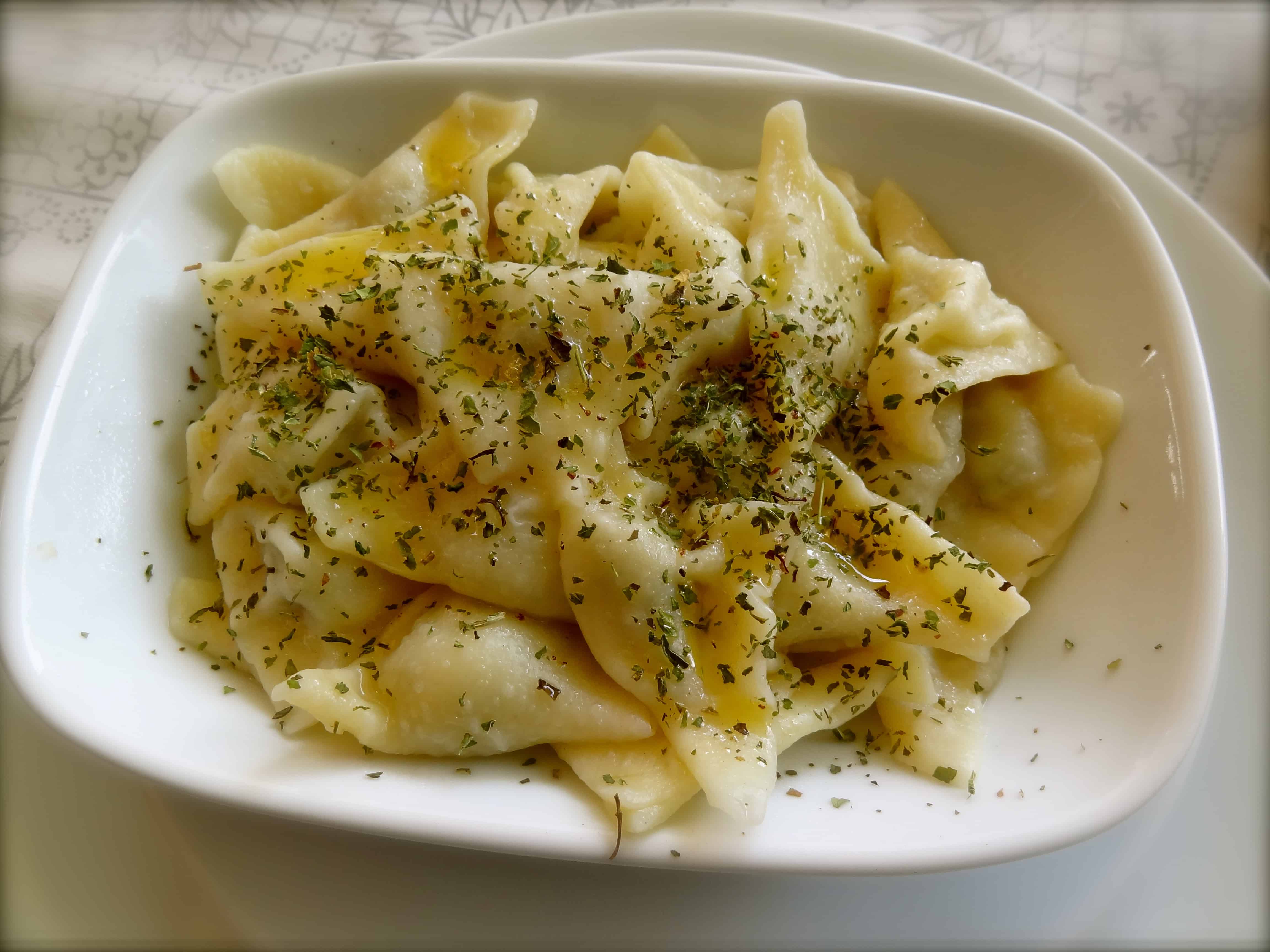 Peruhi: Vegetarian Turkish pasta, stuffed with a bit of cheese and mint, and cooked with yoghurt, milk and olive oil.